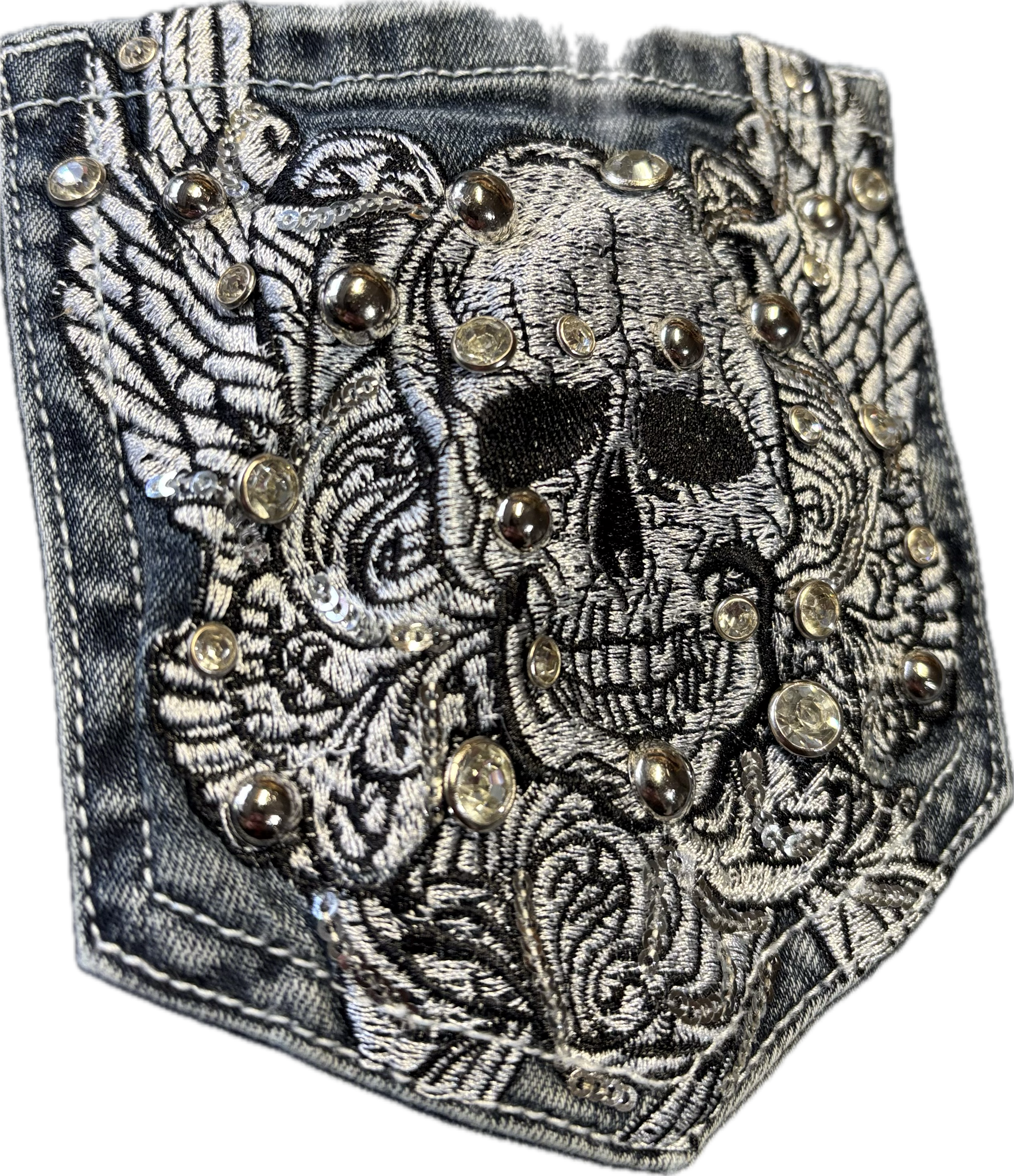 Your new favorite jeans just got sassier! 5 pocket bootcut with skull pocket and sexy wing & roses detail. Super soft denim with the perfect amount of stretch. Ow ow! Sparkle on ladies! ✨